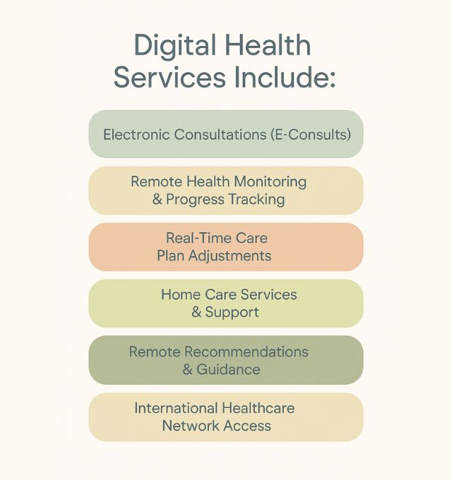 Patients with chronic conditions requiring ongoing monitoring, busy professionals needing flexible consultation schedules, individuals in remote locations with limited healthcare access, international travelers seeking continuous care, elderly patients preferring home-based services, and anyone requiring specialist consultations without travel constraints.